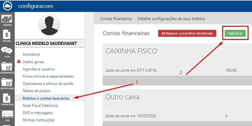 O primeiro passo a fazer é configurar uma conta bancária para recebimento dos valores. Para isso, acesse o módulo de Ajustes(configuração) > Boletos e contas bancárias no menu lateral da esquerda e preencha os dados.