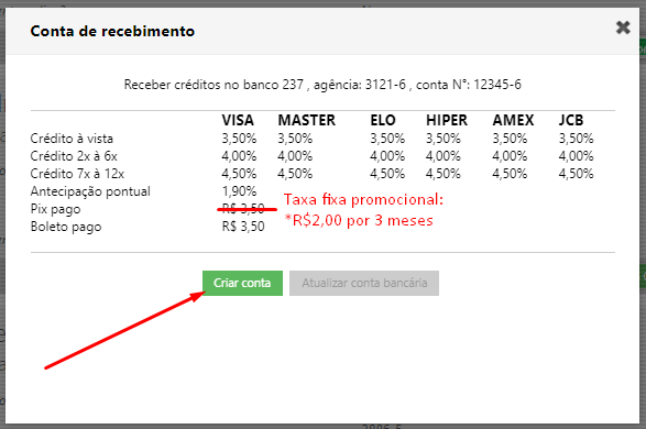 Depois, na conta recém criada, clique na opção "Pagar.me" para solicitar ao serviço de pagamento a criação da sua conta, clicando, em seguida, no botão Criar conta.