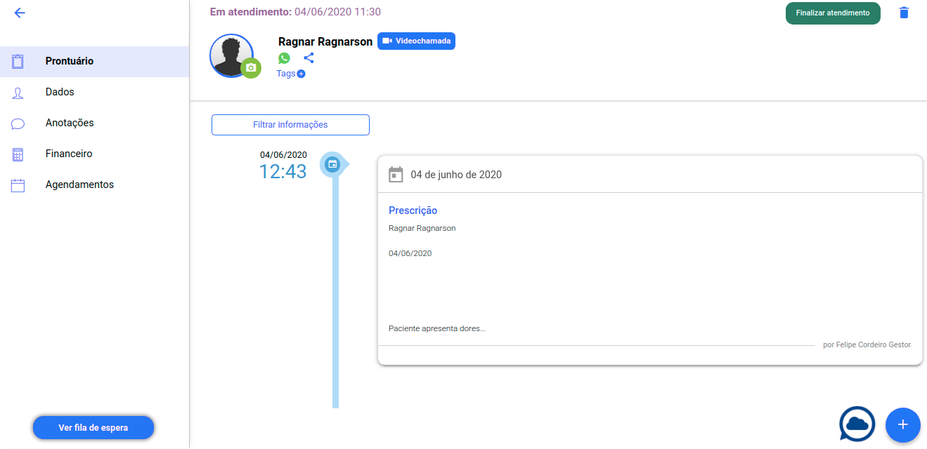 Clicando em iniciar o atendimento o atendimento será realizado. A visão do atendimento é ilustrada na imagem abaixo. 1) apresenta alguns dados sobre o paciente, ao clicar será exibido, 2) Possibilita a inserção de receitas, condutas, anexação de exames entre outros, 3) exibição da linha do tempo do paciente, 4) Adição de tags ao paciente, interação por vídeo chamada (telemedicina) e por rede social, 5) finaliza o atendimento e 6) permite a visualização da fila de espera.