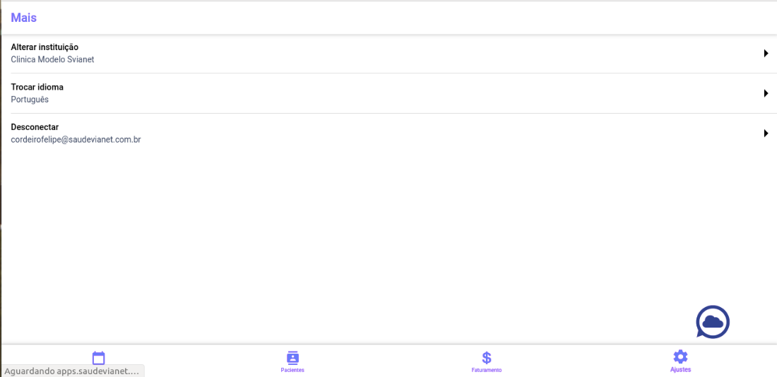 A aba de ajustes permite a alteração da instituição, caso o usuário possua mais de uma. Também é possível alterar o idioma (português e inglês), além de sair do sistema clicando em desconectar.