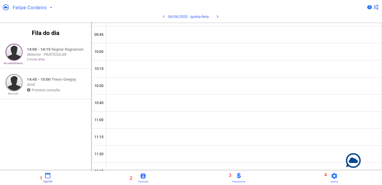 Ele possui 4 abas, sendo: 1) agenda, 2) pacientes, 3) faturamento e 4) ajustes.