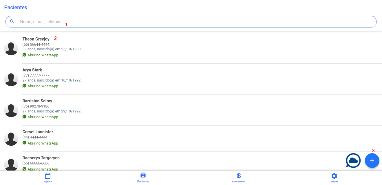 A aba de pacientes permite pesquisar por um usuário (1), através do nome, e-mail ou telefone. Após encontrar o paciente desejado pode abrir conversa diretamente pelo whatsapp e acessar os dados do paciente (2). A visualização será como a apresentada na imagem do atendimento 1) agenda. No botão com um + (3) é possível adicionar um novo paciente ao sistema.