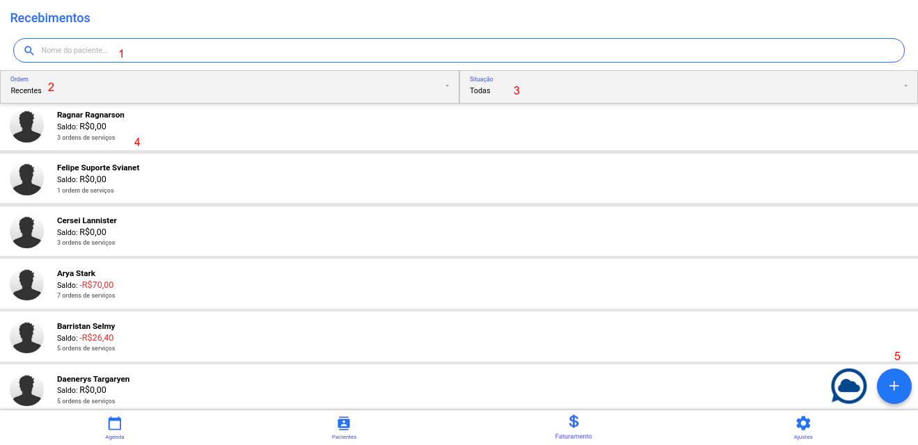 Em faturamento é visualizado um resumo financeiro do paciente na instituição. Pode pesquisar pelo paciente (1), ordenar pela forma de exibição (2) e filtrar por situação de status no pagamento (3) . Também é possível detalhar a situação de um usuário clicando nele (4) e adicionar um novo recebimento a um paciente (5).