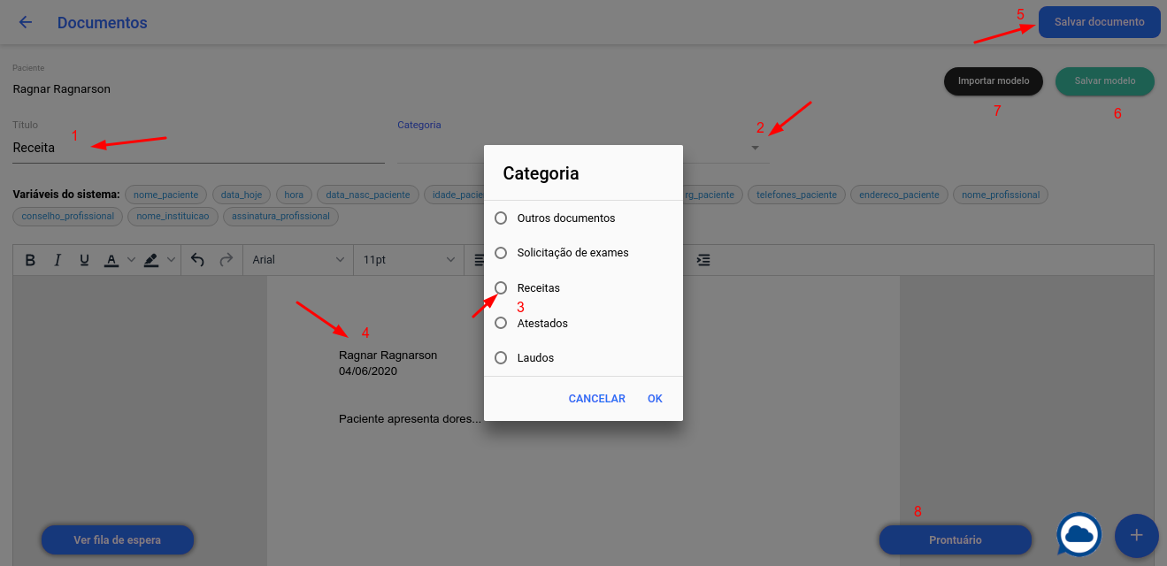 Ao selecionar o item Documentos (2), imagem acima, a visão será a da imagem abaixo. Nele é possível criar vários tipos de documentos. Nesse exemplo dei o nome de Receita (1) e adicionei a categoria de receita (2) e (3). Em (4) é possível digitar o conteúdo da receita, além de usar as variáveis do sistema, otimizando o tempo, e então salvar o documento (5). Também é possível utilizar a criação de modelos em 6) e a utilização deles clicando no (7). Além disso, (8) permite visualizar o prontuário do paciente enquanto faz a prescrição.