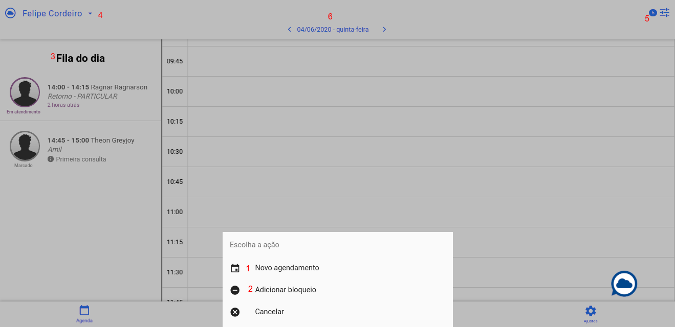 Ao clicar em um horário é possível adicionar um 1) novo agendamento ou adicionar um 2) bloqueio de horário. No 3) possível ver a fila de atendimento do profissional da agenda, mas caso queira também é possível trocar a agenda ou selecionar ver todas as agendas 4). No 5 é permitido filtrar por quais status de agendamento devem ser exibidos na agenda. O 6 possibilita alternar os dias da visualização da agenda do profissional, clicando nos ícones