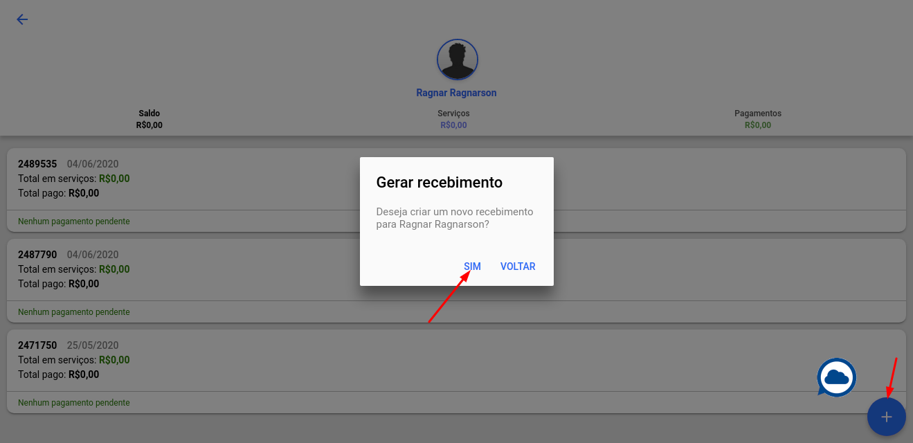 Clicando na Ordem de serviço será exibido uma tela com (1) Serviços e (2) Pagamentos. Para adicionar um serviço ou procedimento precisa selecionar uma das duas opções e então clicar no ícone de + (3).