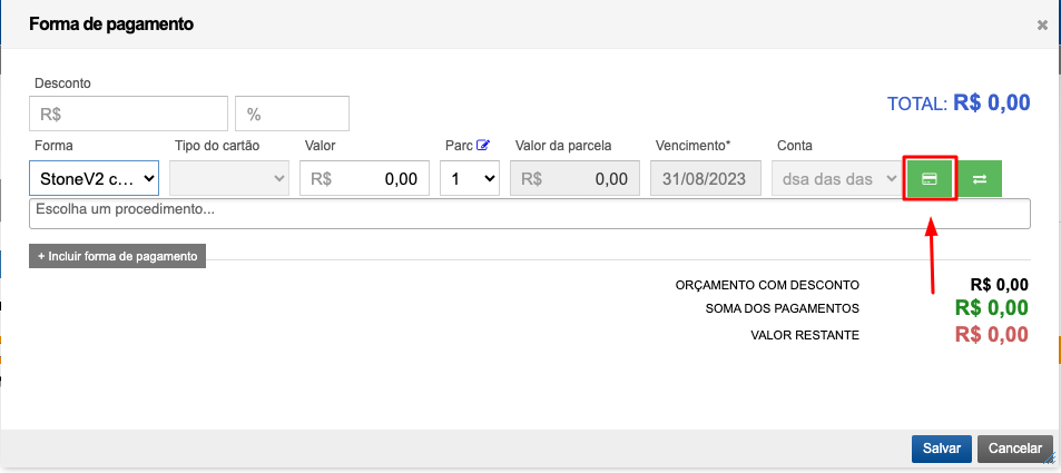 Para enviar o pedido para maquininha, após selecionar uma das 3 formas de pagamento acima, clique sobre o no botão verde ao lado da conta.
