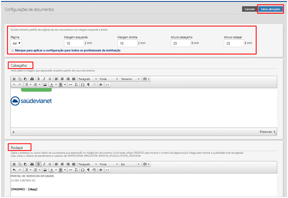 Na Opção Configurações de Documentos, você poderá configurar e editar o cabeçalho e o rodapé, lembrando que é importante configurar as margens do papel para impressão.