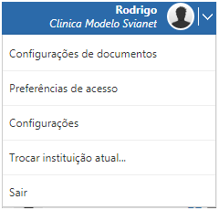No menu principal haverá algumas opções para serem modificadas ou atualizadas da forma como preferir: Configurações de documentos, Preferências de acesso, Configurações, Trocar de instituição atual e Sair da conta que acessa.
