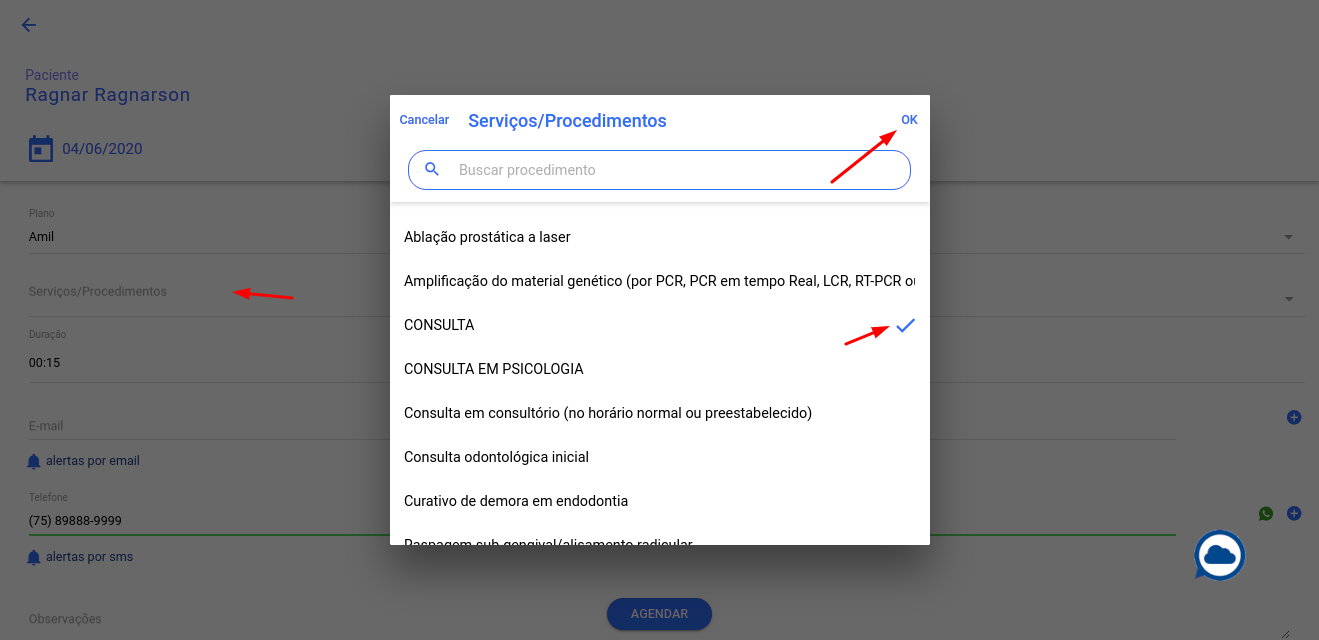 Em novo agendamento é preciso selecionar o paciente, e então adicionar os dados do agendamento. Selecionar os procedimentos, clicar em ok e depois em agendar para finalizar o agendamento.