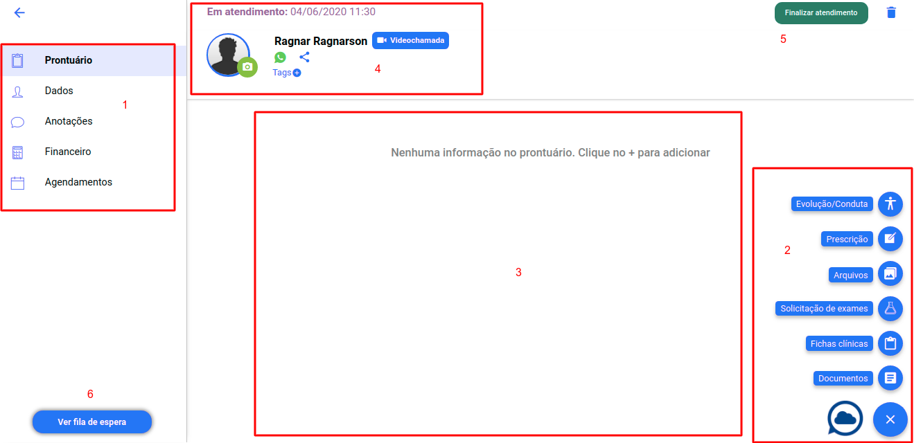 Clicando em iniciar o atendimento o atendimento será realizado. A visão do atendimento é ilustrada na imagem abaixo. 1) apresenta alguns dados sobre o paciente, ao clicar será exibido, 2) Possibilita a inserção de receitas, condutas, anexação de exames entre outros, 3) exibição da linha do tempo do paciente, 4) Adição de tags ao paciente, interação por vídeo chamada (telemedicina) e por rede social, 5) finaliza o atendimento e 6) permite a visualização da fila de espera.