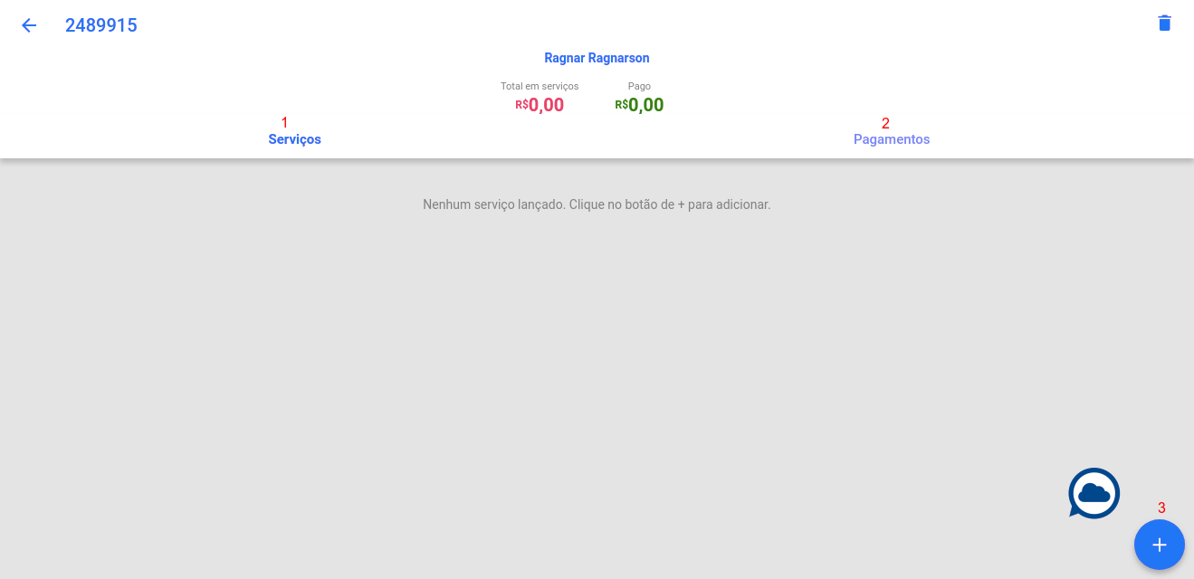 Clicando na Ordem de serviço será exibido uma tela com (1) Serviços e (2) Pagamentos. Para adicionar um serviço ou procedimento precisa selecionar uma das duas opções e então clicar no ícone de + (3).