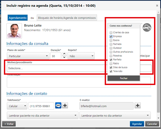 Na tela seguinte, você preenche as Informações da Consulta. No campo "Motivo/procedimento" você informa os procedimentos a serem realizados. Os motivos estão associados a tabelas de preços previamente definidas no Menu "Configurações". Lá você também informa o tempo médio de cada procedimento.