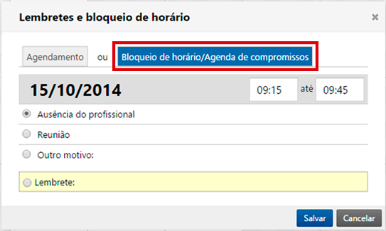 Na opção "Bloqueio de horário/Agenda de compromissos", você pode ocupar o horário com alguma outra atividade não-relacionada a atendimentos de pacientes. E se clicar em lembrete ainda pode notifica-lo por e-mail ou sms.