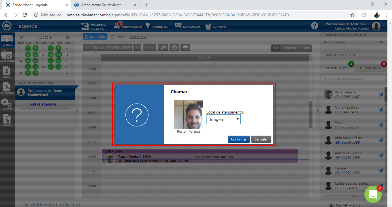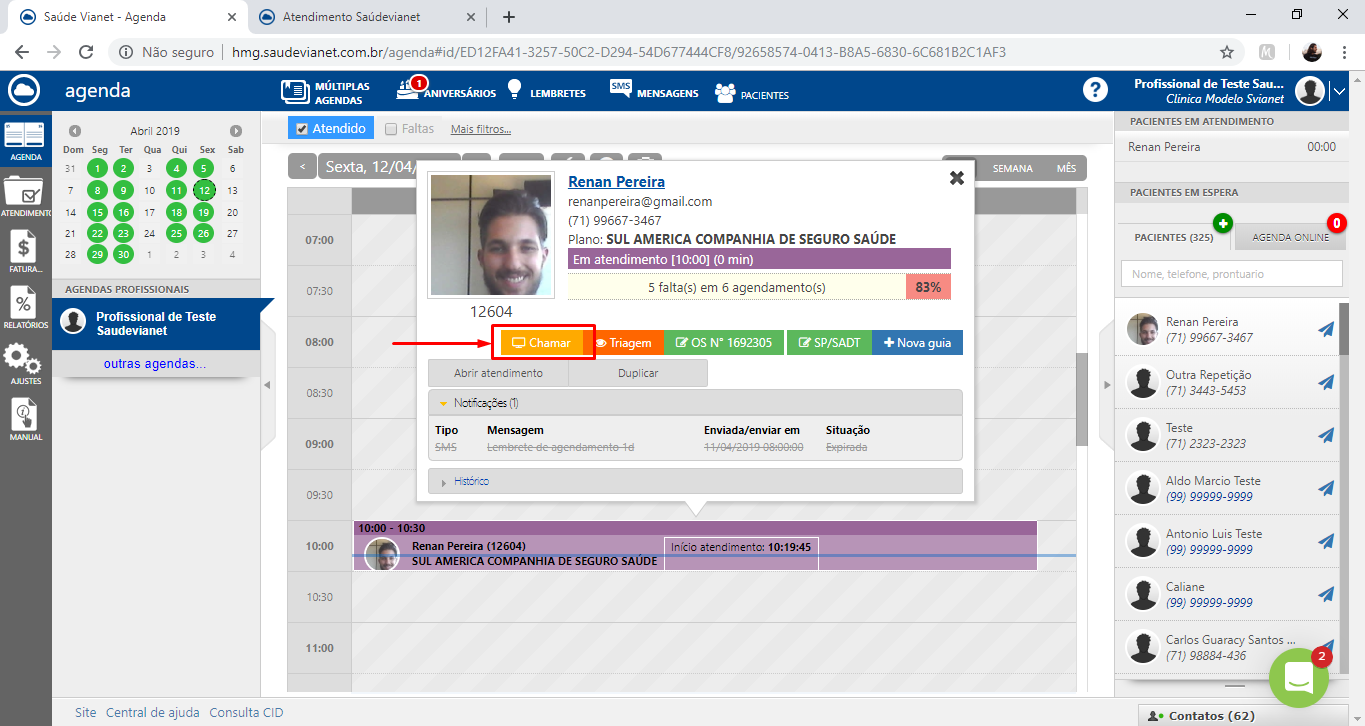 3 - Você poderá chamar um paciente para o atendimento através da agenda do Saúde Vianet ou do módulo de atendimento. Obs.: O botão Chamar só aparecerá se o paciente estiver na clínica com o status "Em espera". Conheça os status do paciente na agenda: Clique aqui.