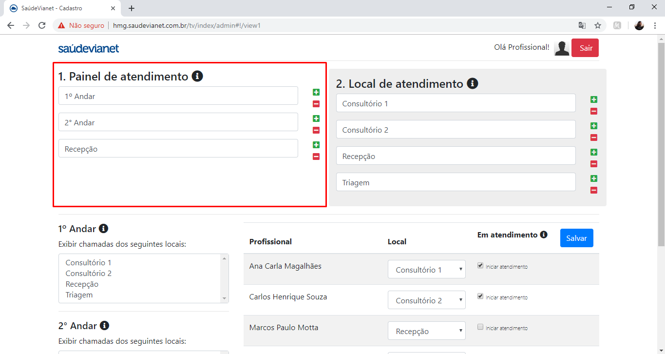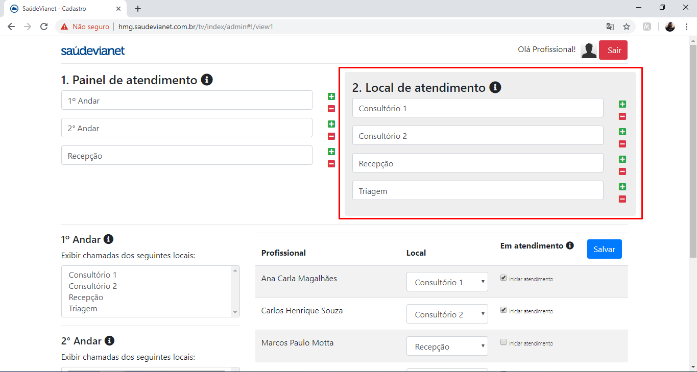 4 - Em "local de atendimento", você indicará todos os consultórios e salas que serão usadas para os atendimento. Por exemplo: Consultório 1, Triagem, etc.