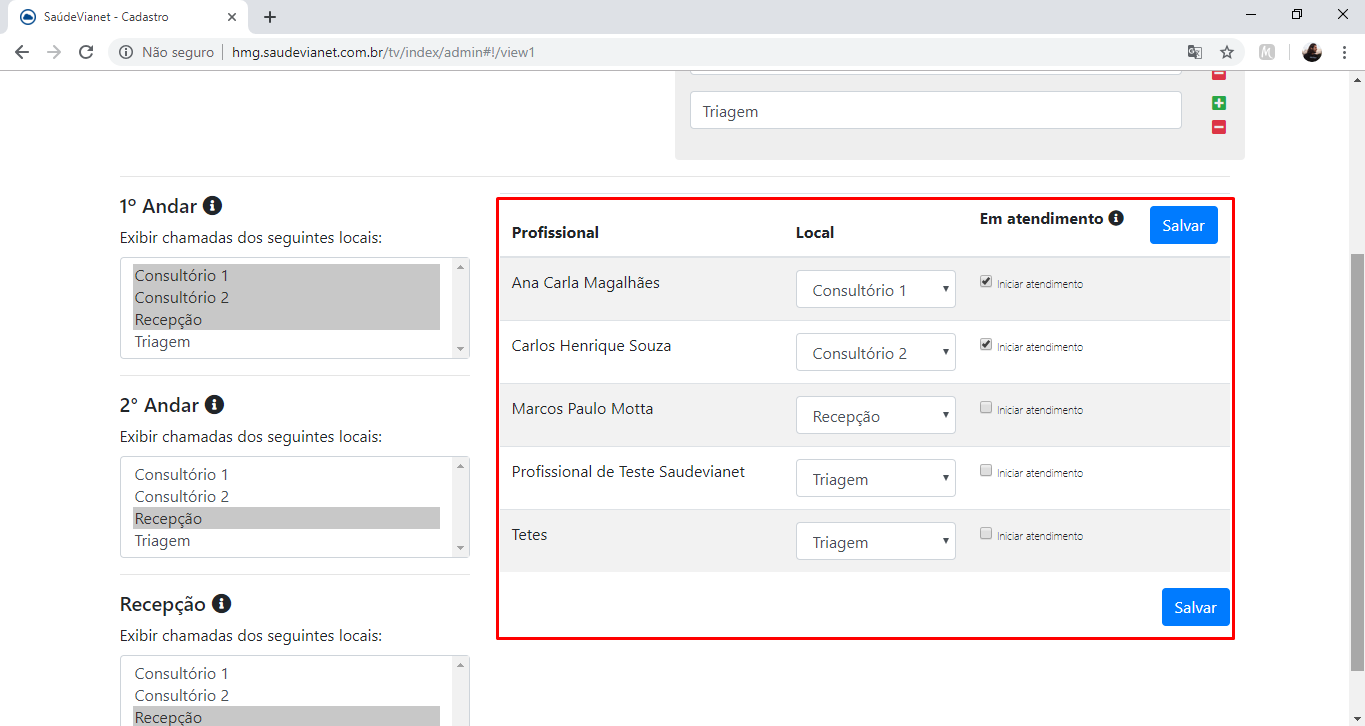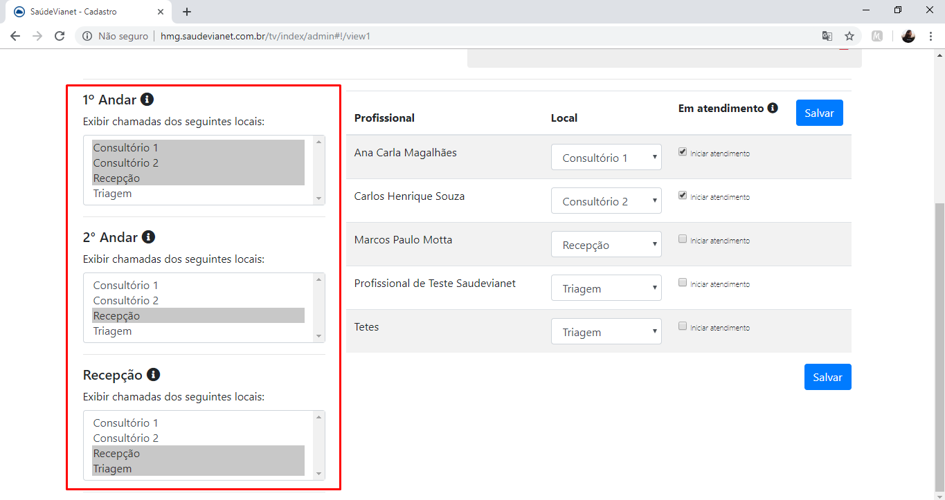 5 - Agora, você deve indicar qual "local de atendimento" aparecerá em cada "painel de atendimento", ou seja, quais salas apareceram em cada TV disposta na sua clínica. Selecione a opção de "local de atendimento" para cada "painel de atendimento" clicando sobre eles. Para selecionar mais de um local em cada painel, pressione [Shift] + clique sobre as opções.