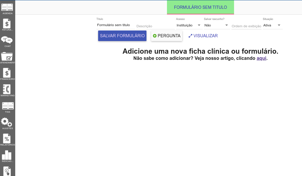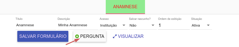 3 - Após clicar em "+ PERGUNTA" será exibido um formulário para preenchimento com as perguntas que devem constar nessa ficha;