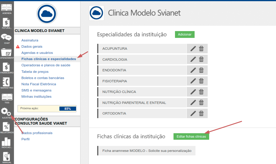 Você poderá utilizar este recurso através do módulo de configuração (ajustes). Selecione a seção de Fichas Clínicas e especialidades e então clique em Editar fichas clinicas.