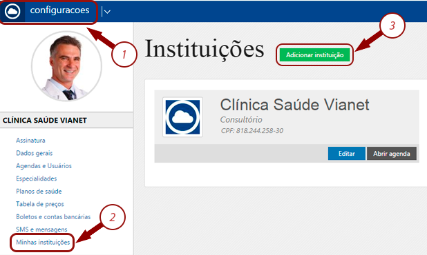 Desse modo, caso tenha mais de uma instituição, basta você cadastrar vários locais de atendimento em Configurações (1) >>Minhas Instituições (2) >>Adicionar Instituição (3)