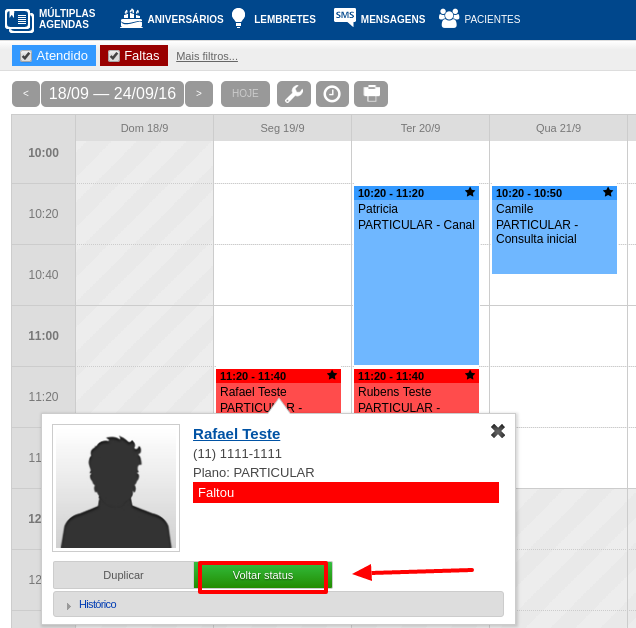 1) Localize o agendamento que recebeu falta e clique nele, depois disso clique em "Voltar Status".