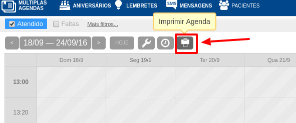1) Na tela de agendamentos, clique no ícone da impressora localizado na parte superior da agenda.