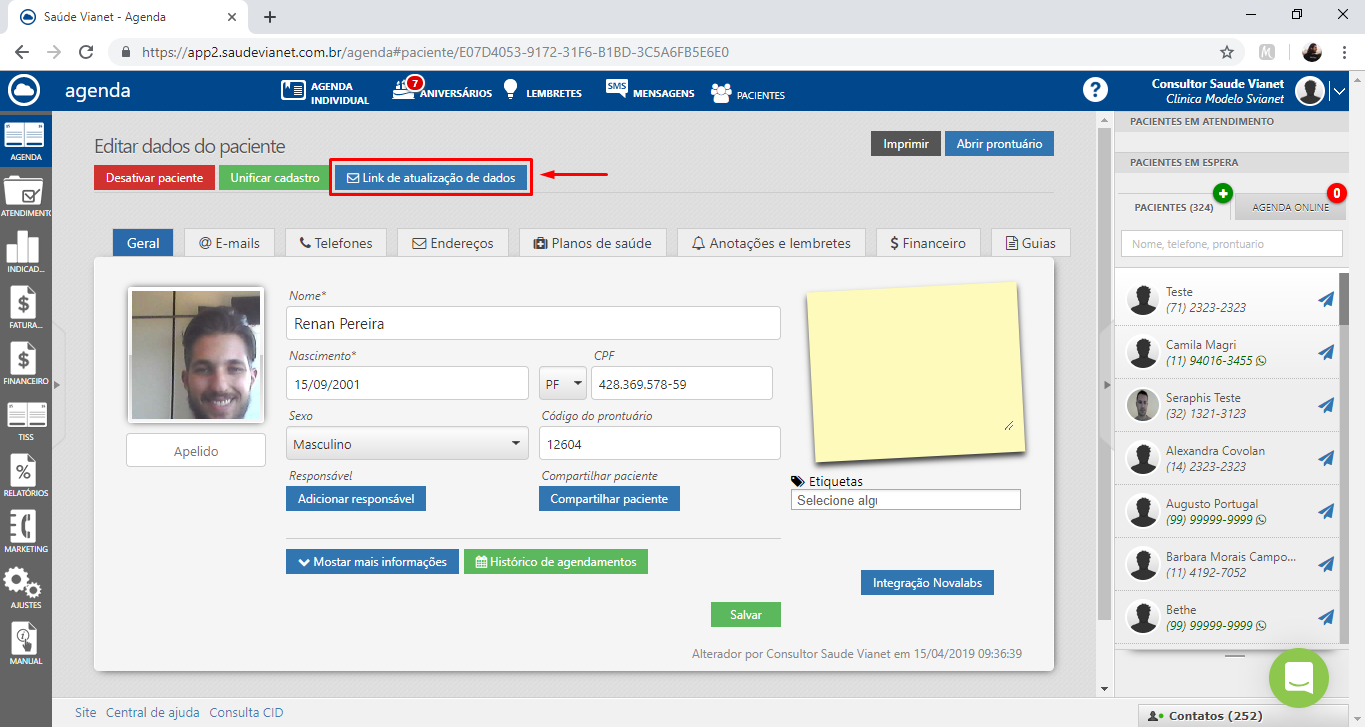 2 - No perfil do seu paciente, clique no botão "Link de atualização de dados". Uma mensagem de confirmação aparecerá em sua tela. Clique em "Confirmar".