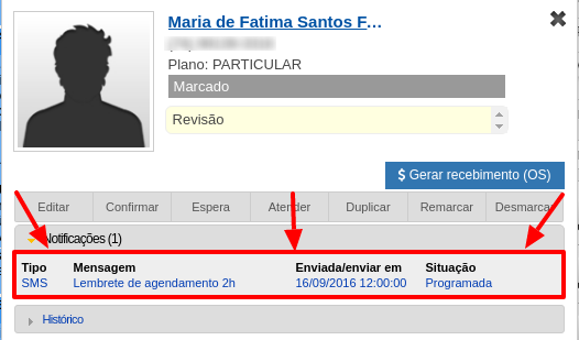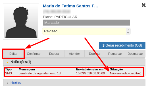 Retorne à agenda, clique novamente no paciente e confira se o status do SMS não enviado sofreu alteração. Depois disso, o SMS será enviado novamente para o paciente e ele será devidamente notificado sobre sua consulta.