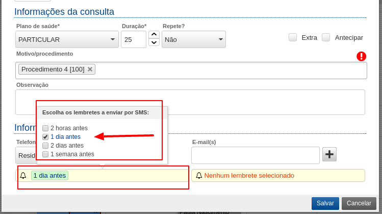 Dentro da página de edição do agendamento, você terá a opção de alterar a mensagem de lembrete da consulta, é possível alterar clicando na caixa que está escrito que informa a quantidade de dias que a mensagem está programada e selecionar a opção que desejar.