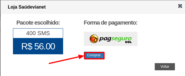 Depois de clicar em “comprar mais SMS”, o sistema irá revelar uma nova janela, onde é possível selecionar o pacote de SMS’s desejado.