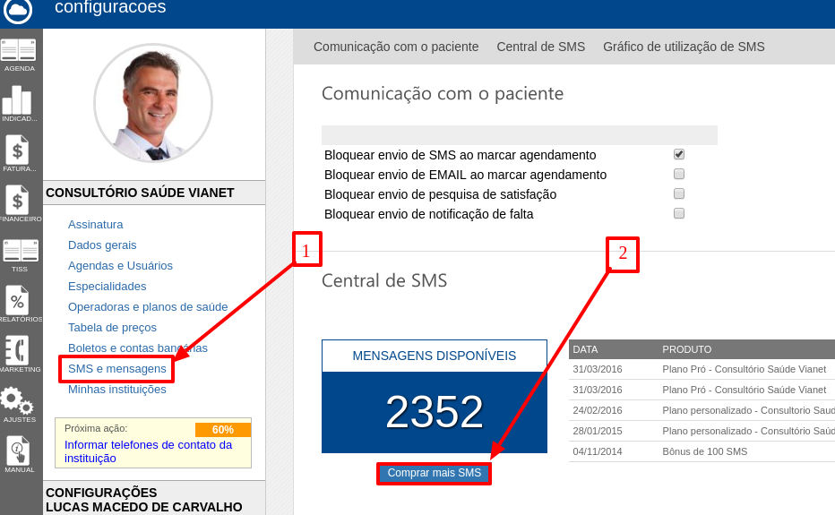 Após isso, você verá no menu que surge do lado esquerdo da tela, uma lista com as opções de configuração do sistema. Clique em “sms e mensagens” e depois em “comprar mais SMS”.