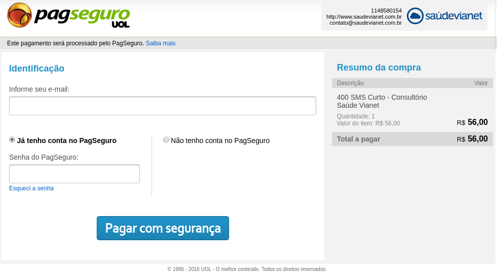 Selecione o pacote desejado e a janela irá migrar para o fechamento, onde clicando em comprar você será re-direcionado para a página do “Pagseguro uol”. Na página do “UOL” você preenche os dados e conclui sua compra. Pronto, agora você pode continuar notificando seus pacientes para que eles não faltem a consulta.