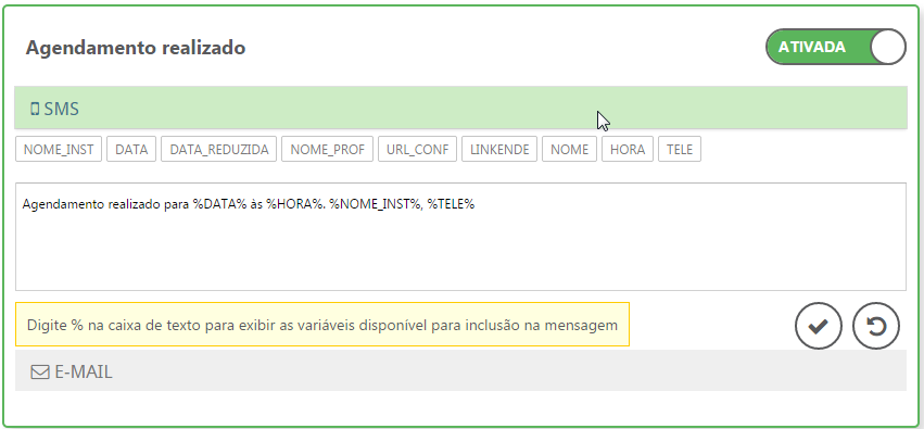 Você pode utilizar as variáveis listadas acima da caixa de texto em sua mensagem, que o sistema irá substituirá ao enviar a mensagem. Você pode utilizar o atalho "%" para listar as variáveis da mensagem. Ao finalizar a edição clique no botão "V" para salvar. Caso deseje voltar para a mensagem padrão do sistema, clique no botão "Restaurar".