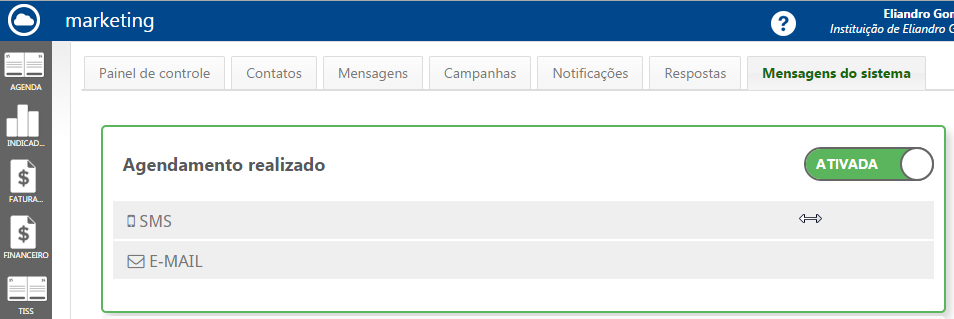 Você pode clicar em SMS para alterar o texto dos torpedos SMS e em e-mail para alterar seu mail-marketing.