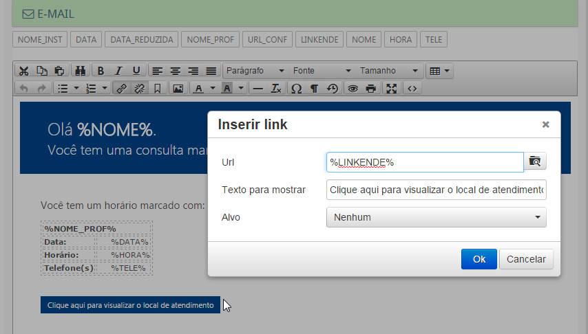 Na edição de mensagens de e-mail é importante ter um pouco de conhecimento em HTML para editar o modelo de forma avançada. Para incluir as variáveis de link você deve clicar no botão "link" da barra de ferramentas e digitar em maiúscula o nome da variável com prefixo e sufixo o caracter "%", conforme imagem abaixo.