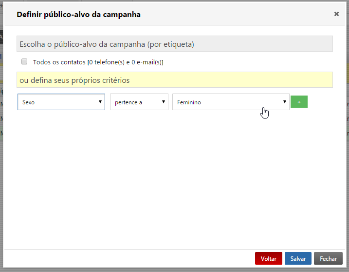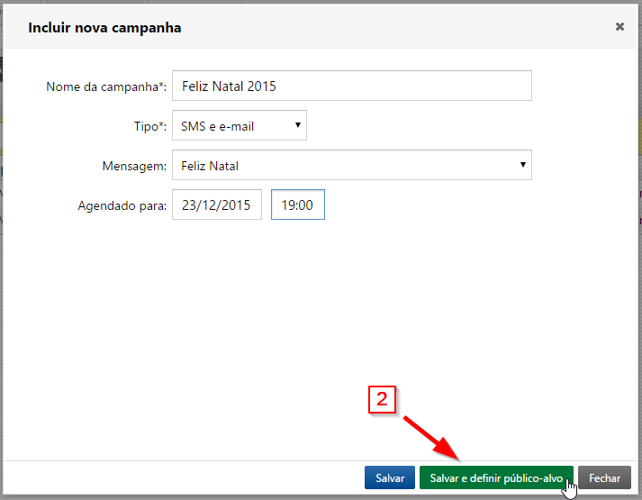Mas, é na aba “Campanhas” que você realmente dispara as mensagens. Em (1) você inclui uma nova campanha. Basta escolher uma das mensagens que você definiu na aba “Mensagens”, a data e o horário para o disparo da mensagem. Depois, clique em (2) para salvar a nova campanha e prosseguir para a tela de definição do público-alvo.
