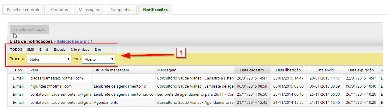 Na aba “Notificações”, você pode ver o que aconteceu com cada mensagem enviada, podendo filtrá-las (1) e verificar os status das mensagens e se certificar se o seu contato a recebeu.