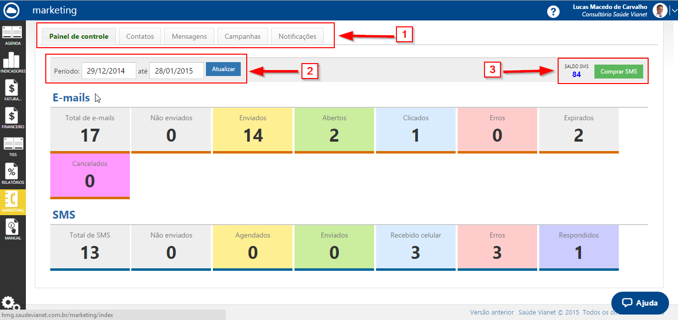 Assim como nos aplicativos Faturamento e Financeiro, você usa as abas (1) para navegar entre as principais seções. Logo na primeira tela, você tem uma visão geral do que aconteceu com as suas mensagens num determinado período, que pode ser definido em (2). Para adiquirir mais SMS, basta clicar no botão “Comprar SMS” (3).