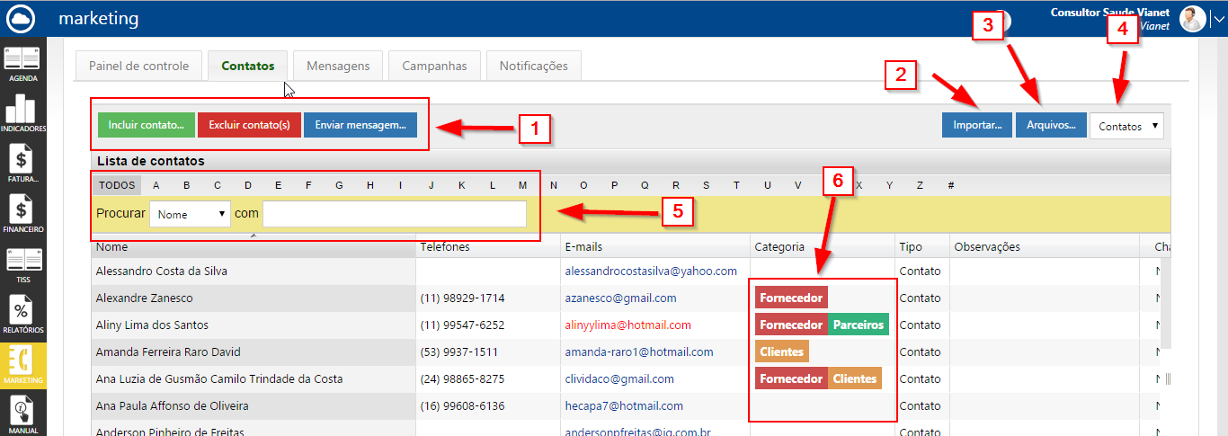Em (6), você pode atribuir uma ou mais etiquetas de categoria a um contato. Desse modo, quando você precisar elaborar uma campanha de Marketing, será possível direcioná-la apenas aos pacientes que possuem determinada(s) categoria(s).