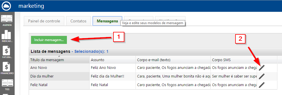 Na aba “Mensagens”, você cria e gerencia as mensagens que serão disparadas nas campanhas. Em (1) você inclui uma nova mensagem de email e/ou SMS e, em (2), você pode editar qualquer mensagem como e quando desejar.