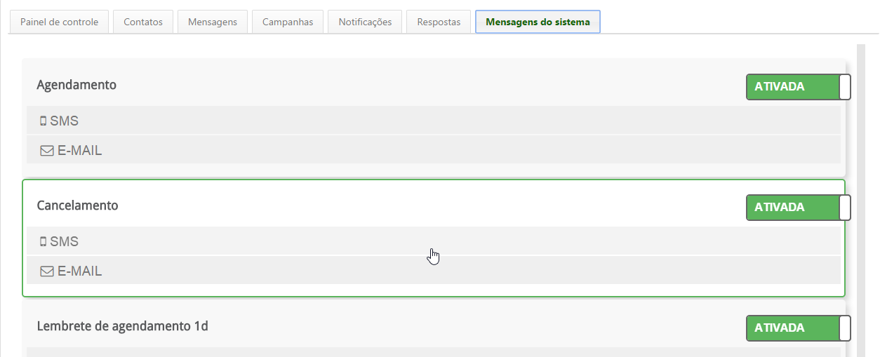 Na aba “Mensagens do sistema”, você pode editar as mensagens de email e SMS que são enviadas automaticamente na rotina do agendamento, como lembretes de confirmação e mensagens de falta.