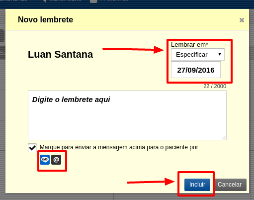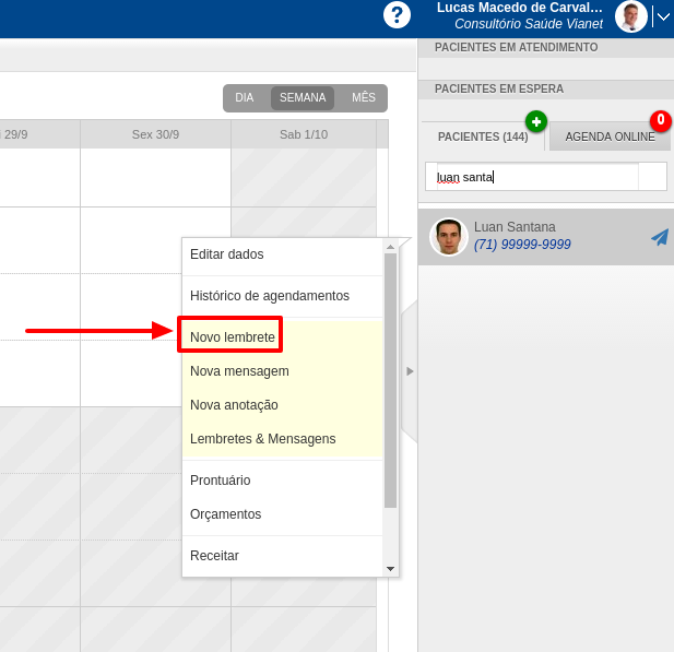 3) Clique no paciente e escolha a opção "Novo Lembrete".