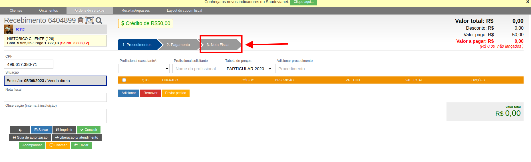 2º passo: Na tela da ordem de serviço, procure pelas abas disponíveis e selecione a opção "3. Nota Fiscal".