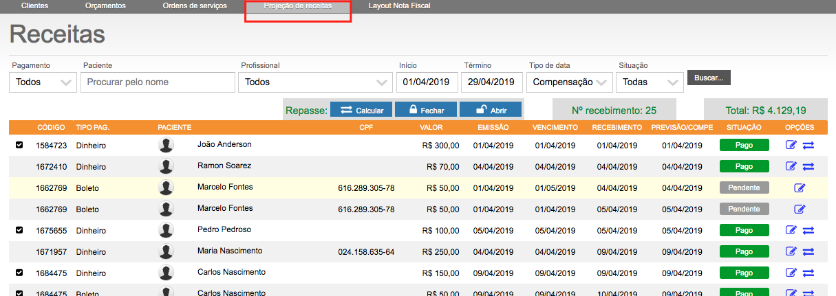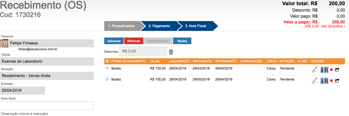 Em sua agenda eletrônica Saúde Vianet você terá a opção faturamento, podendo cadastrar novos pacientes, emitir o valor de cada procedimento e verificar se tem algo pendente como atraso, pagamento com vencimento próximo ou pagamento aprovado.