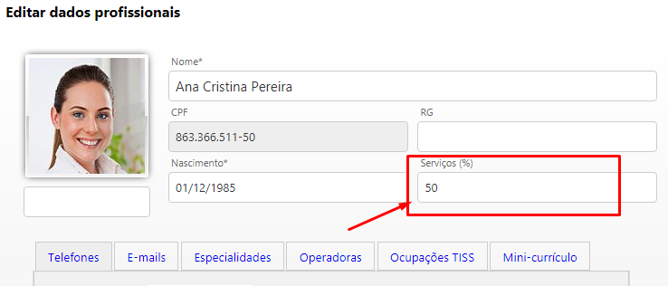 2. Clique sobre o profissional no qual deseja informar o percentual do valor a ser repassado e preencha o campo "serviço".