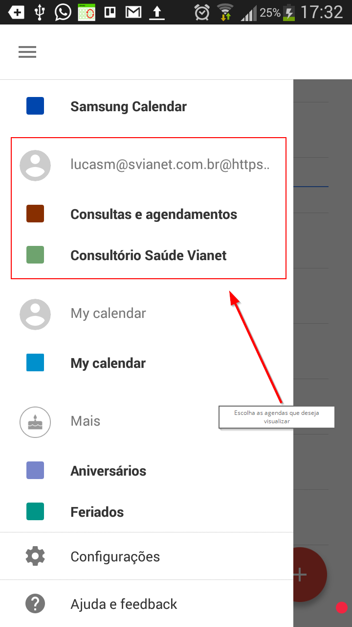 7. Ir na agenda do google, configurações e marcar as agendas a sincronizar.