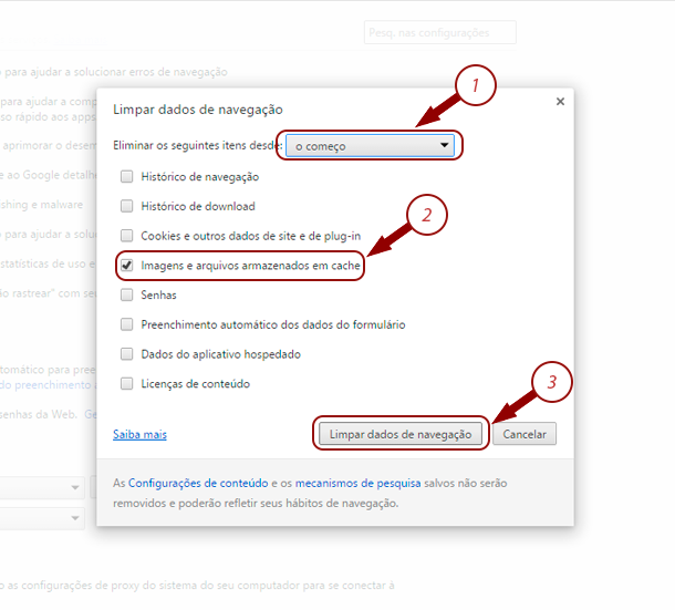 Para windows: pressione, no seu teclado, as teclas Ctrl + Shift + Delete e, na tela que aparece, configure conforme a figura abaixo. Em seguida, clique em "Limpar dados de navegação" (3);