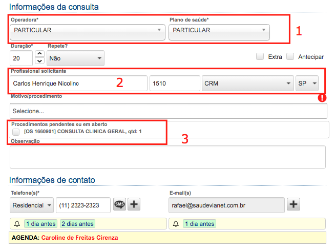 O agendamento ficou muito mais poderoso. Agora você pode incluir o plano de saude (1) da operadora, o profissional solicitante (1) e ter o relatório, e o mais interessante. Todos os procedimentos que estão em aberto (que não foram executados) são listados (3) e basta que seja marcado a caixinha para informar o que foi agendado.