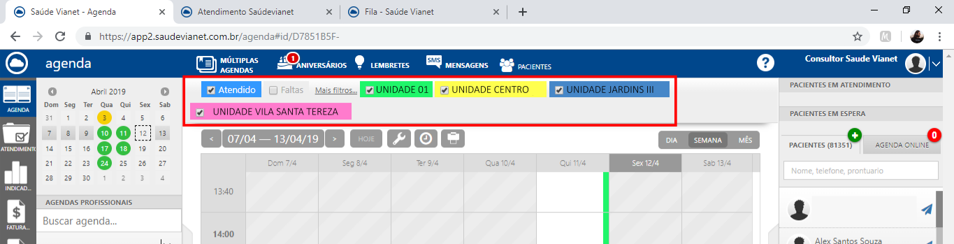 Agora é possível visualizar várias agendas de um profissional em instituições diferentes de uma única vez. Nessa configuração, as agendas são destacadas visualmente pela cor da legenda da clinica.