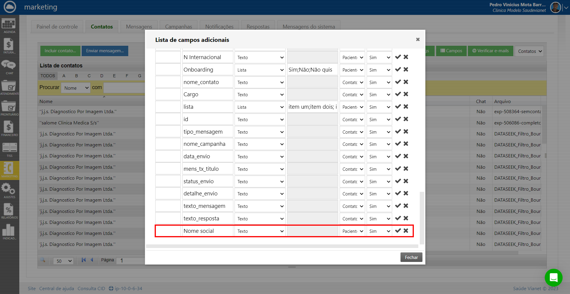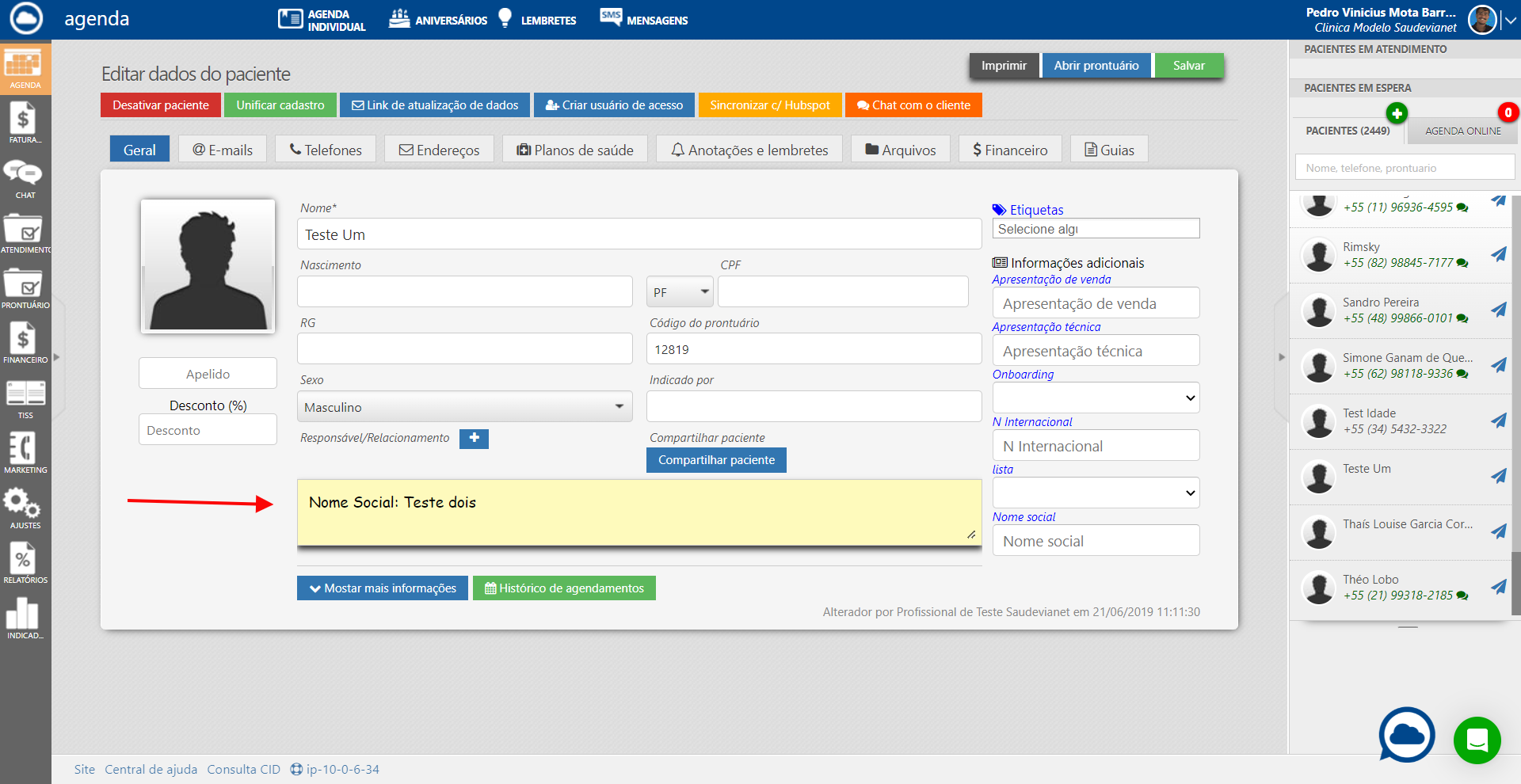 Após isso, você pode preencher com a informação deseja que apareça na página do cadastro do paciente. Neste exemplo iremos utilizar o campo de Nome Social: